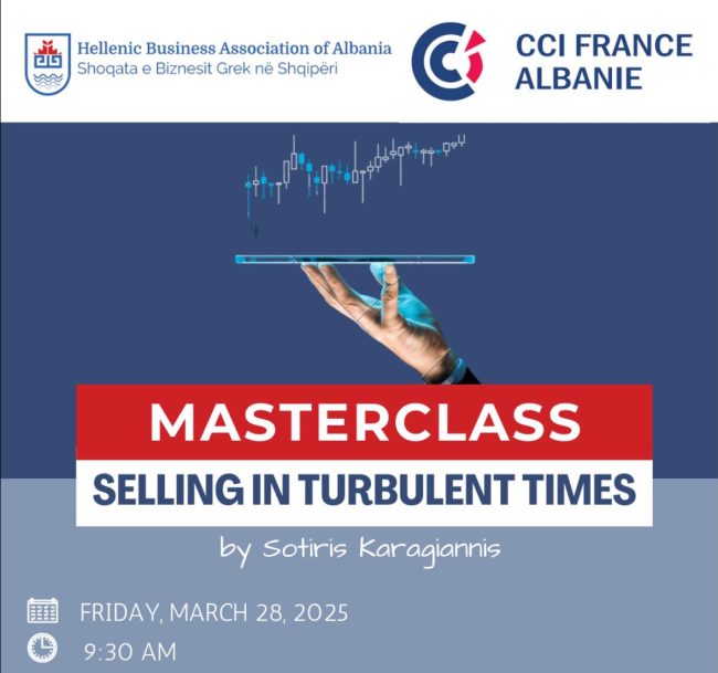 Shoqata e Biznesit Grek në Shqipëri, në bashkëpunim me Dhomën e Tregtisë Franceze në Shqipëri, organizoi një Masterclass të specializuar me temën “Selling in Turbulent Times”, me profesorin Sotiris Karagiannis. Pjesëmarrësit patën mundësinë: të thellohen në sfidat e reja të shitjeve, të eksplorojnë strategji moderne të qasjes ndaj klientëve dhe të kuptojnë se si…