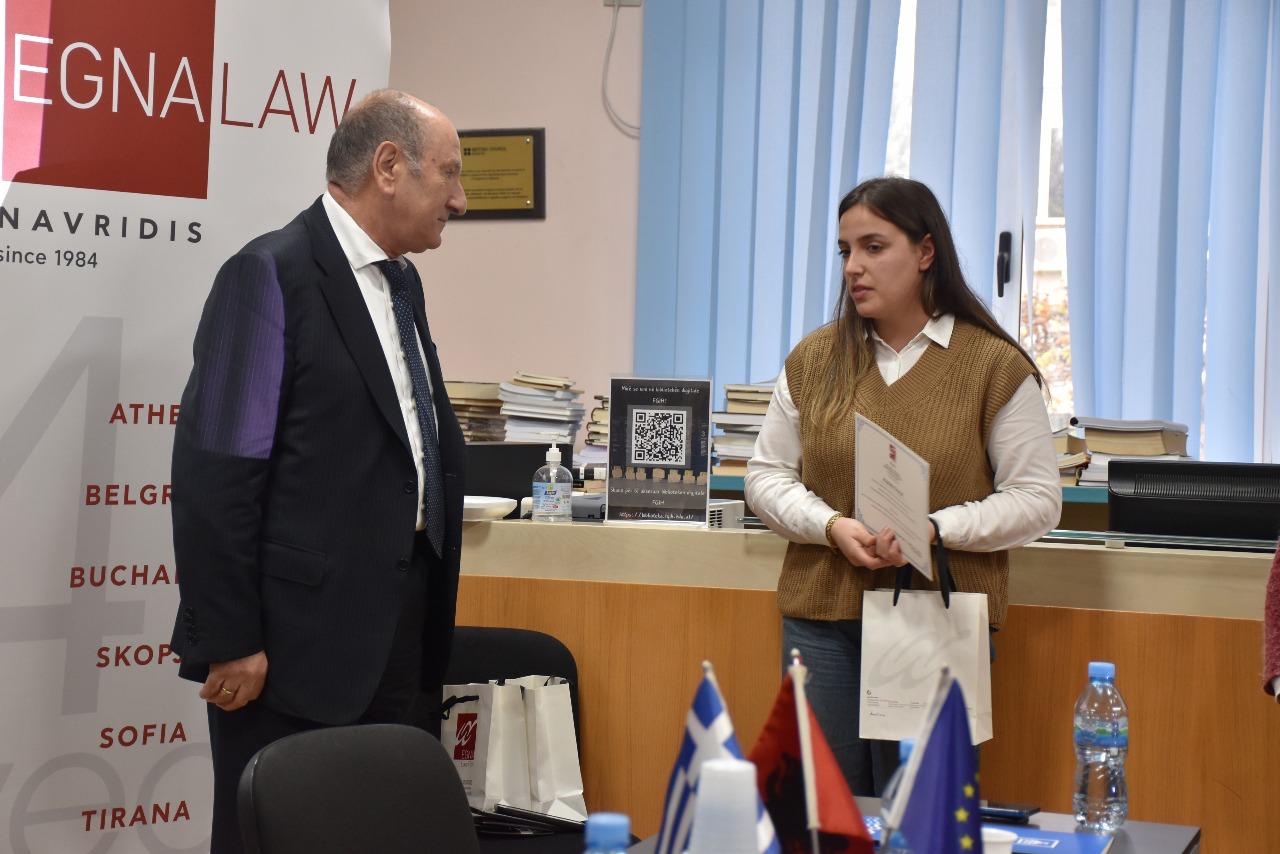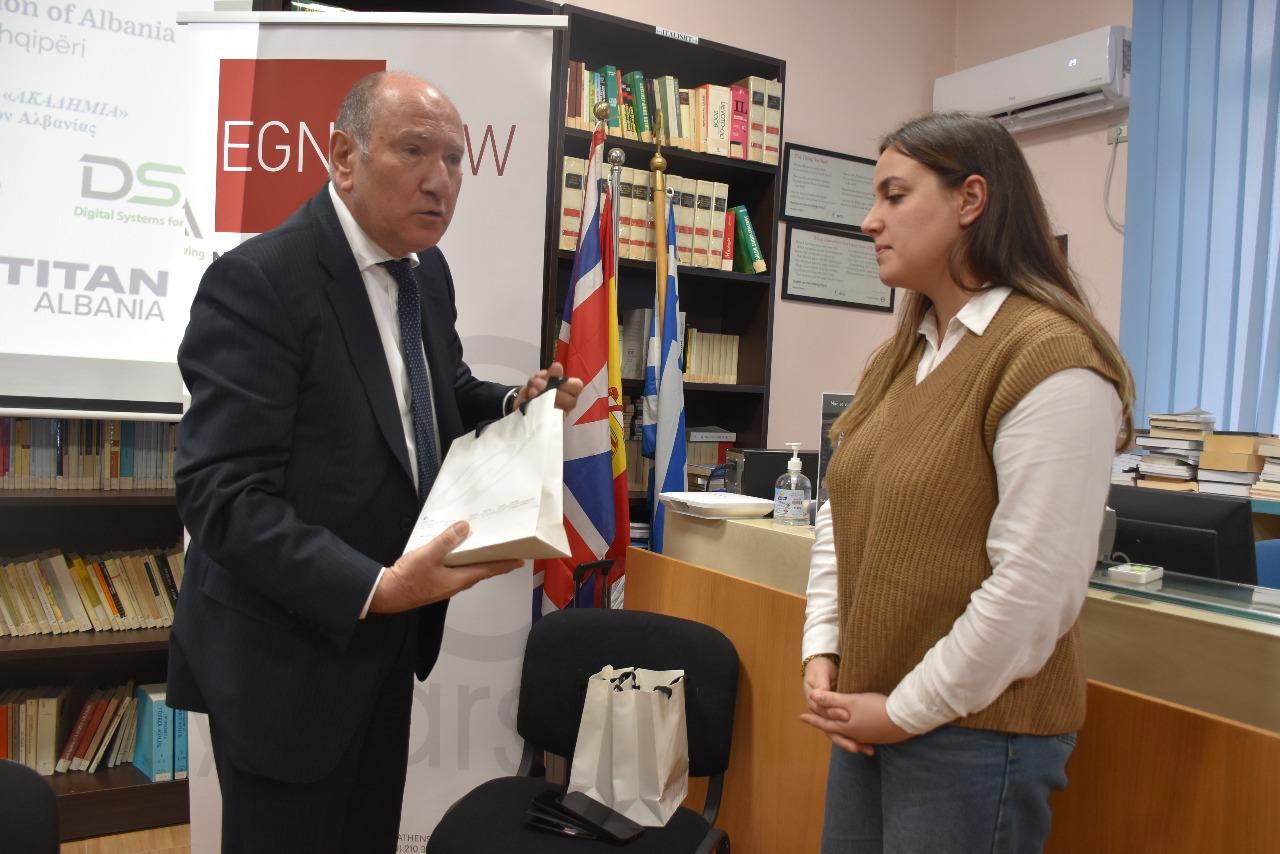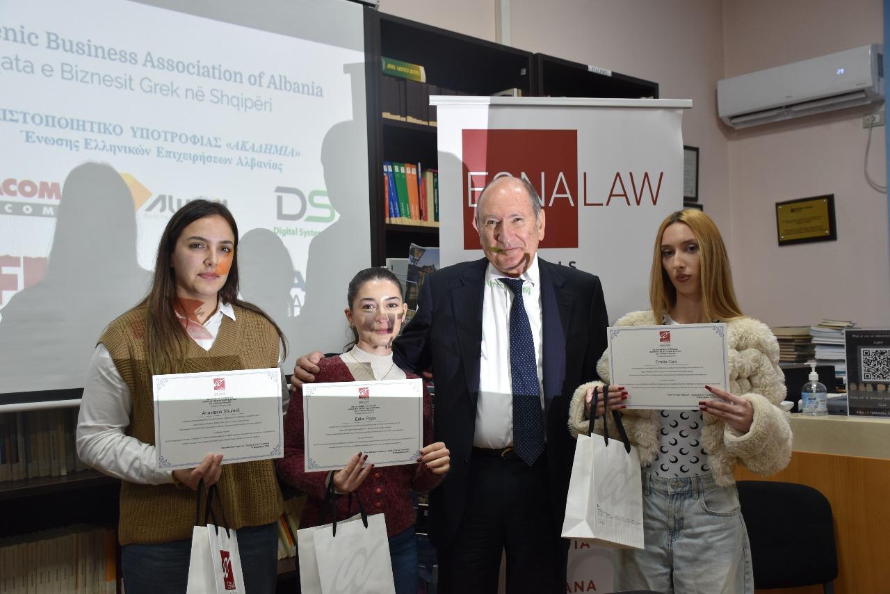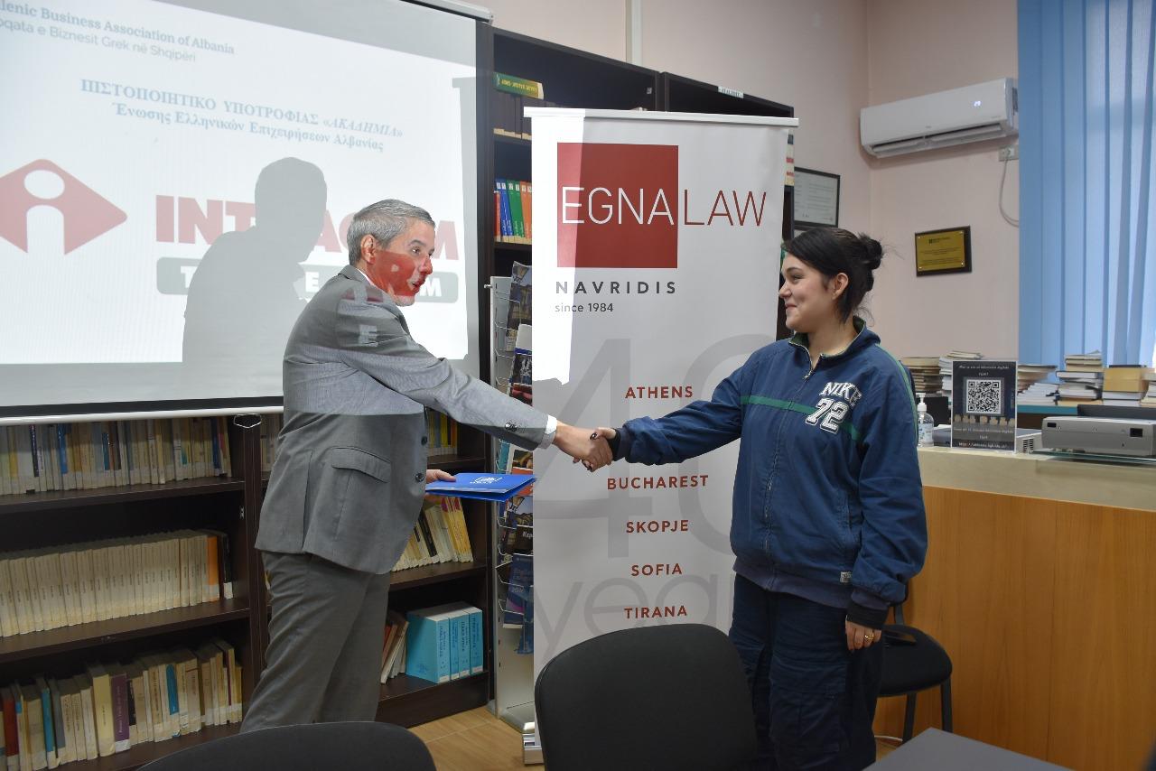 Vlen të theksohet se z. Efthymis Navridis, Themelues i EGNA Law Firm dhe anëtar i Shoqatës, ofroi këtë vit tre bursa, duke vijuar mbështetjen e tij të pandërprerë për Departamentin e Gjuhës Greke. Përmes kontributit të tij dhe bursës së institucionalizuar «Profesor Vassos Karageorgiou», ai mbështet në mënyrë domethënëse studentët dhe kontribuon realisht në forcimin e edukimit në gjuhën greke në Shqipëri.