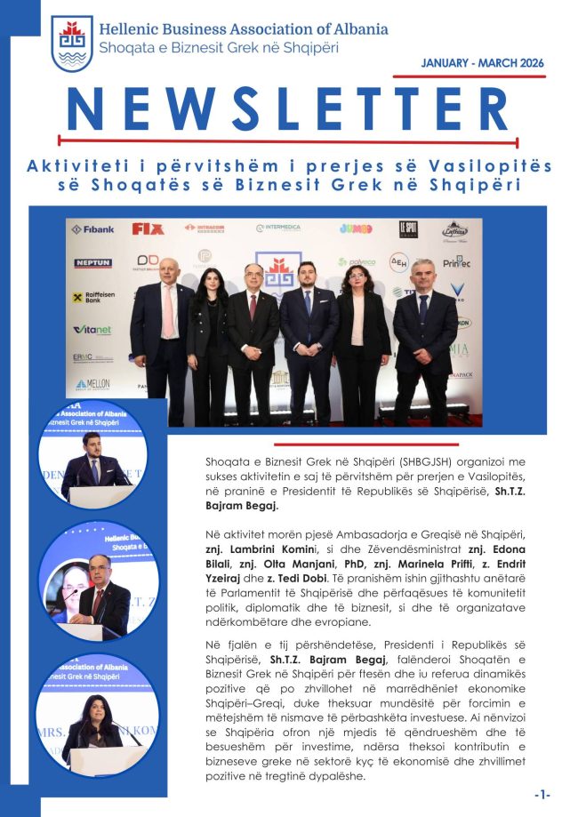 Shoqata e Biznesit Grek në Shqipëri zhvilloi një takim pune me Presidentin e Dhomës së Tregtisë dhe Industrisë së Athinës (ACCI | Athens Chamber of Commerce and Industry), z. Ioannis Bratakos, në kuadër të përpjekjeve të vazhdueshme për forcimin e marrëdhënieve ndërinstitucionale dhe promovimin e bashkëpunimit ekonomik ndërmjet Shqipërisë dhe Greqisë. Gjatë takimit, u theksua…