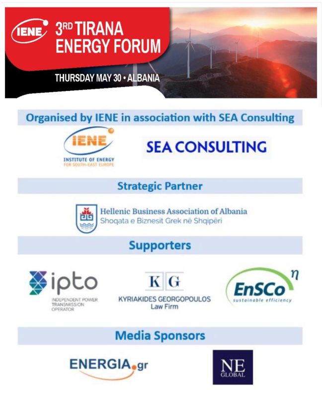 Το Ινστιτούτο Ενέργειας Νοτιοανατολικής Ευρώπης ΙΕΝΕ και SEA Consulting, με Στρατηγικό Εταίρο την Ένωση Ελληνικών Επιχειρήσεων Αλβανίας διοργανώνει για τρίτη φορά το 3rd Tirana Energy Forum! Αξιόλογοι ομιλητές από τον χώρο των ΑΠΕ, της ενέργειας, των καυσίμων, των δημόσιων αρμόδιων κυβερνητικών φορέων αλλά και από περιφερειακούς τομείς θα παρουσιάσουν και θα αναδείξουν μια ευρύτερη ανασκόπηση…